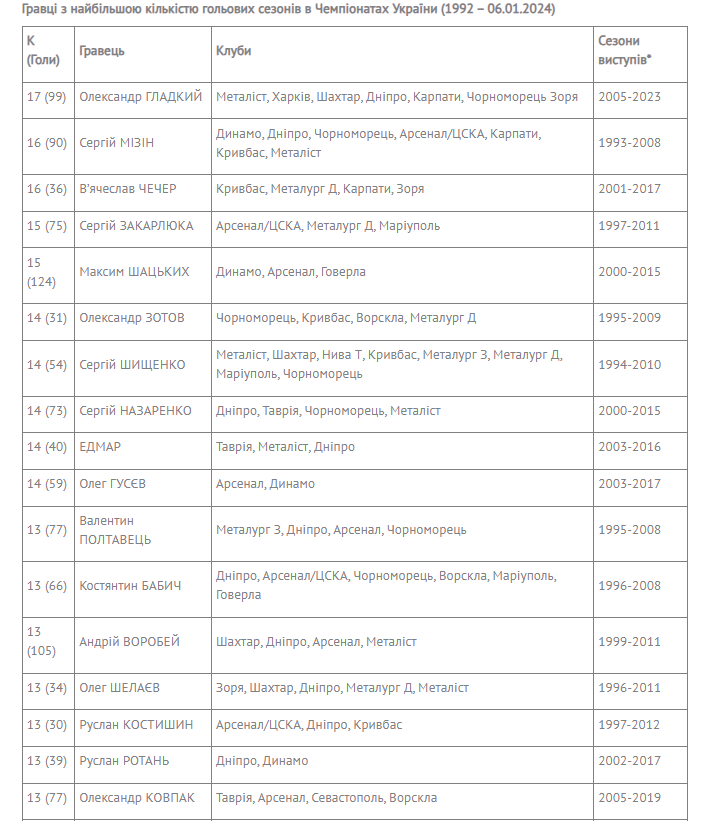 Лидером в этом рейтинге остается Александр Гладкий, в активе которого 17 забивных сезонов.
