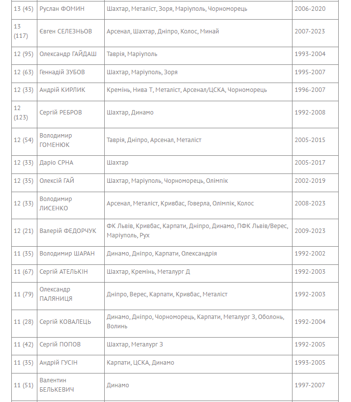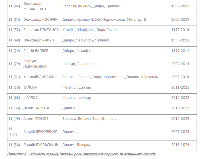 В текущем ЧУ увеличили количество своих забивных сезонов до 11 Андрей Ярмоленко и Виталий Буяльский (оба «Динамо»), до 10 – Андрей Цуриков («Колос»), до 9 – Сергей Сидорчук («Динамо»), Алексей Гуцуляк («Днепр-1»), Дмитрий Хомченовский («Кривбасс») и Филипп Будковский («Полесье»).