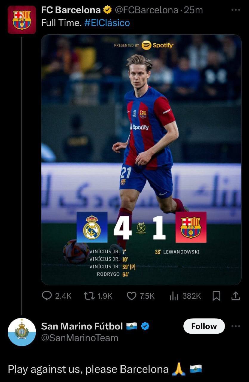 Твиттер-аккаунт Сан-Марино потроллил "Барселону" после поражения от "Реала" в матче за Суперкубок Испании со счетом 1:4.