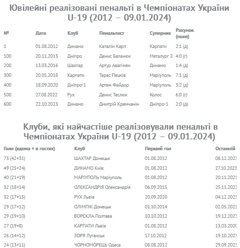 У ході першої частини Чемпіонату України серед гравців до 19-ти років арбітри вже 56 разів призначали 11-метрові удари, а реалізованих пенальті було 49. Загалом же за історію маємо вже 819 юнацьких пенальті, а забитих голів з «позначки» - 625. У поточному сезоні автором ювілейного, 600-го, юнацького голу з «позначки» став Дмитрій Кремчанін з «Динамо», який 22 жовтня 2023 року реалізував 11-метровий удар у ворота «Дніпра-1».
