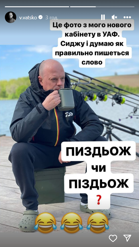 Журналист и блогер выложил фотографию с рыбалки, подписав их так: «Это фото из моего нового кабинета в УАФ. Сижу и думаю, как правильно пишется слово: п****ж или п****ж?»