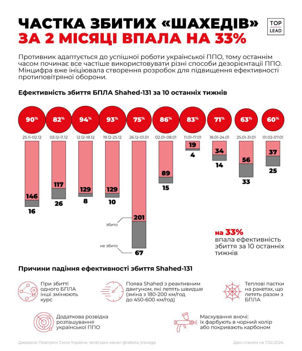 Украинская ПВО стала сбивать на 30% меньше «Шахедов», чем раньше инфографика.