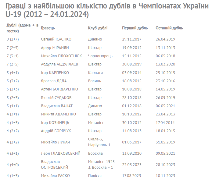 Уже почти пять лет список игроков с крупнейшими коллекциями дублей возглавляет Евгений Исаенко («Динамо»), уже 9 (!) раз забивал за игру по два гола в Чемпионатах U-19. В этот рейтинг в текущем юношеском Чемпионате попали двое молодых игроков - Владислав Островский (в ходе сезона перешел из «Металлиста 1925» в «Ворсклу») и Михаил Раско («Полесье»), которые оформили уже по 4 дубля.