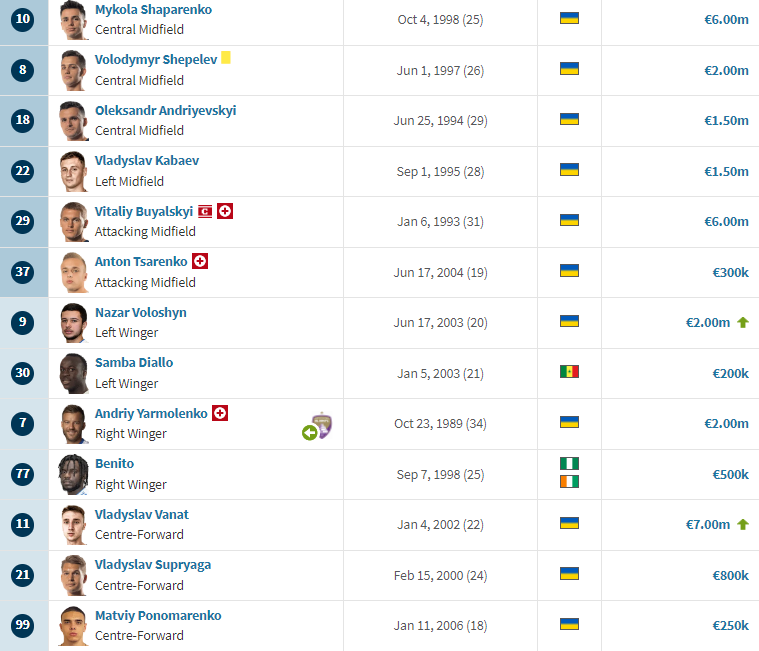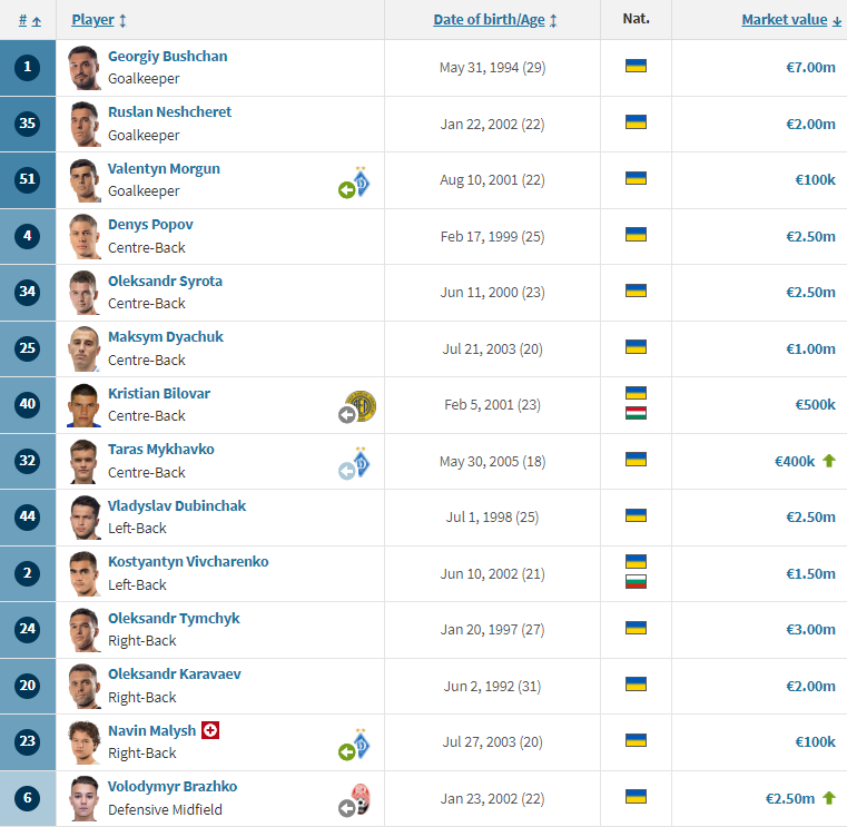 По версии ресурса, самыми дорогими игроками киевской команды являются вратарь Георгий Бущан и нападающий Владислав Ванат, которых оценили по 7 млн евро. Следом за ними следуют два полузащитника Николай Шапаренко и Виталий Буяльский с ценой по 6 млн евро.