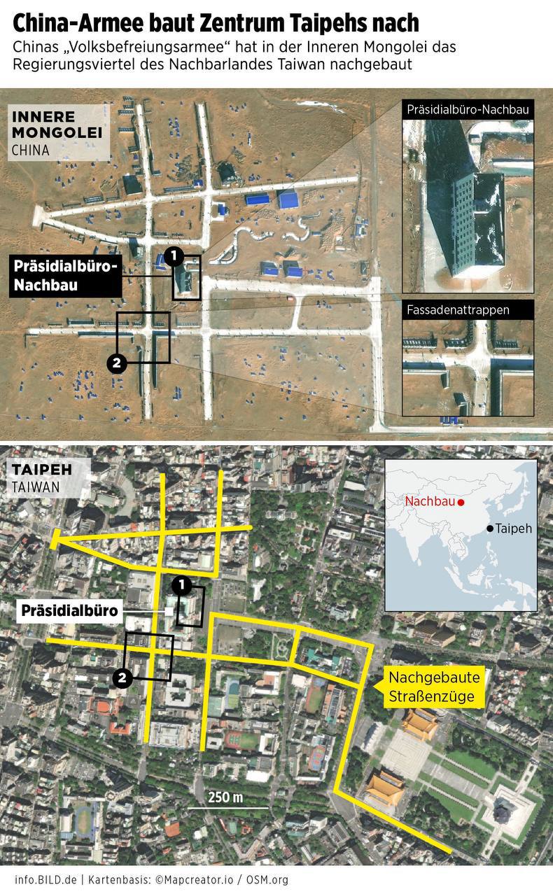 Эксперты проанализировали структуру зданий и улиц и обнаружили, что военное сооружение является точной копией правительственного района Тайбэя — столицы демократического Тайваня.