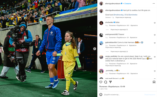 "Это тяжело принять, но жизнь продолжается. Удачи Малиновскому (оба футболиста вместе выступают в Дженоа, – прим.) и Зинченко!" – написал Гудмундссон на своей странице в социальной сети Instagram.