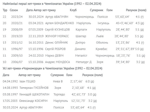 Полузащитник "Черноморца" Артур Авагимян, забив три гола в ворота "Полесья", стал автором первого ( !) хет-трика текущего чемпионата. Произошло это событие только в 22-м туре и первый "трюк со шляпой" оказался самым поздним за всю историю украинских чемпионатов. Авагимян стал также автором самого быстрого из всех 5-ти хет-триков одесского клуба в УПЛ, забив три гола в течение 11-ти (!) минут.