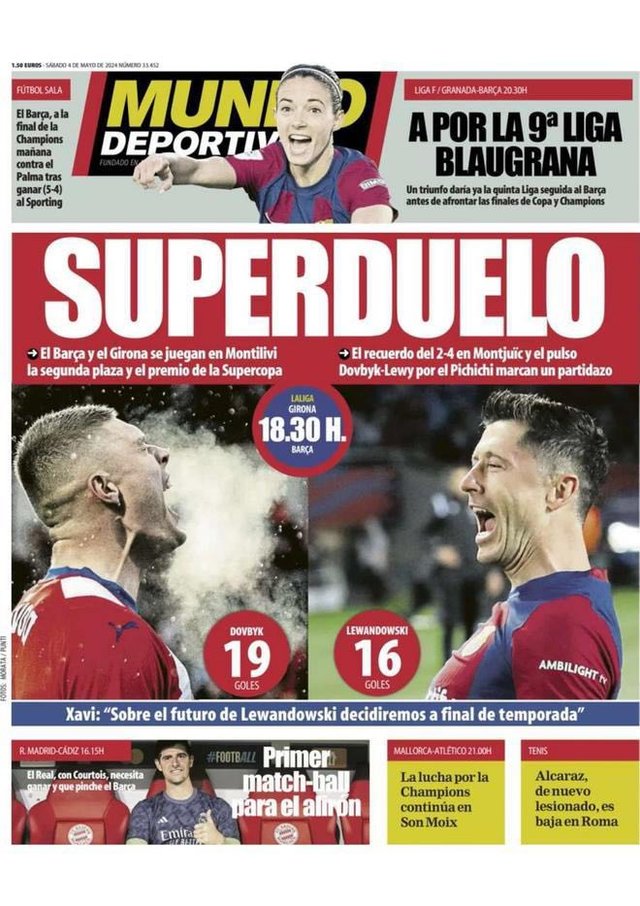 Отдельного внимания стоит дуэль центрфорвардов, претендующих на звание лучшего бомбардира Ла Лиги. Лица Артема Довбика и Роберта Левандовски заполнили первые полосы спортивных изданий Испании. За 5 туров до финиша украинец возглавляет гонку Пичичи, опережая поляка на 3 гола (19 против 16).