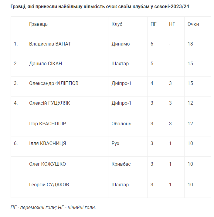 В сезоне-2023/24 самыми ценными оказались голы у лучшего бомбардира чемпионата Владислава Ваната. Форвард «Динамо» забил 6 победных мячей и тем самым фактически принес своей команде 18 очков. На три пункта отстали от Ваната лидеры атак «Шахтера» и «Днепра-1» Даниил Сикан и Александр Филиппов.