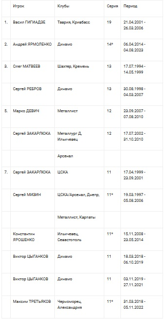 Наиболее продолжительные серии реализованных пенальти в чемпионатах Украины