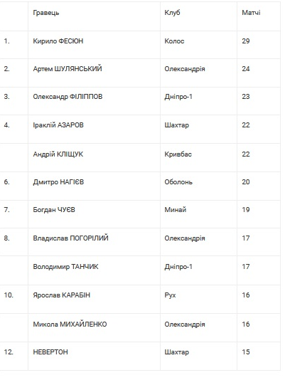 Серед польових гравців пальма першості дісталася хавбеку «Олександрії», Артему Шулянському, який провів 24 матчі. А серед легіонерів найбільш дисциплінованим виявився грузинський захисник «Шахтаря» Іраклій Азаров, який не отримав жодного попередження у 22-х матчах.