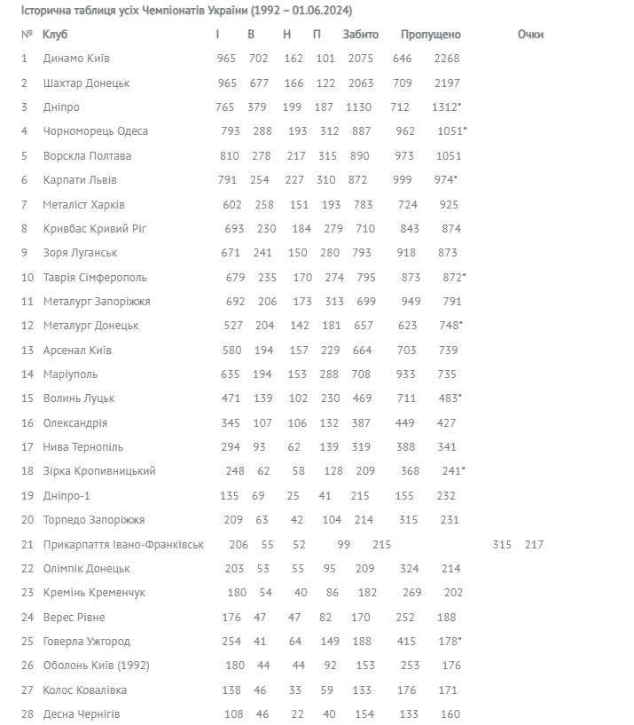 "Динамо" продолжает лидировать в исторической таблице всех чемпионатов Украины