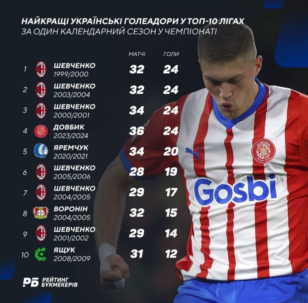 Довбык сравнялся с Шевченко в списке лучших украинских голеадоров в топ-10 лигах за один календарный сезон в чемпионате