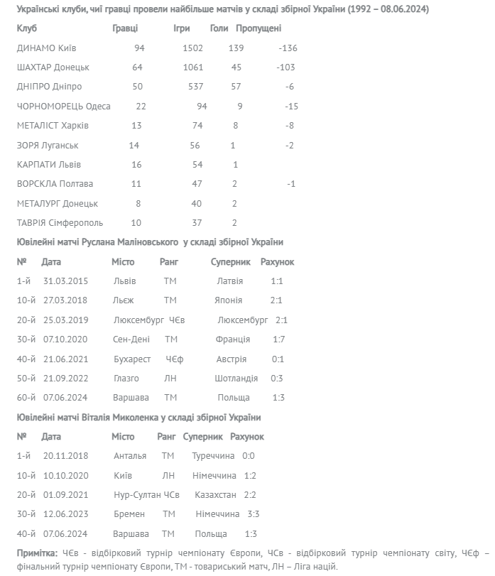 Событиями матча на Национальном стадионе стали и юбилейные факты. Руслан Малиновский провел свой 60-й матч в составе сборной, Виталий Миколенко – 40-й, Николай Шапаренко – 30-й, а Михаил Мудрык – 20-й. Произошли знаковые события и в клубном представительстве игроков в составе сборной Украины. Богдан Михайличенко был первым представителем "Полесья" в составе главной команды Украины. При этом "Полесье" стало 30-м (!) украинским клубом, чьи представители защищали на поле честь "сине-желтых". Лидирует здесь «Динамо», чьи 94 игрока провели в составе сборной 1502 игры и именно в Варшаве была покорена юбилейная отметка в 1500 (!) матчей. Артём Довбик забил свой 9-й гол за сборную Украины и теперь по этому показателю разделяет 10-13 места в списке лучших бомбардиров «сине-желтых». Ранее по 9 голов за нашу сборную забивали Андрей Гусин, Андрей Воробей и Александр Зинченко.