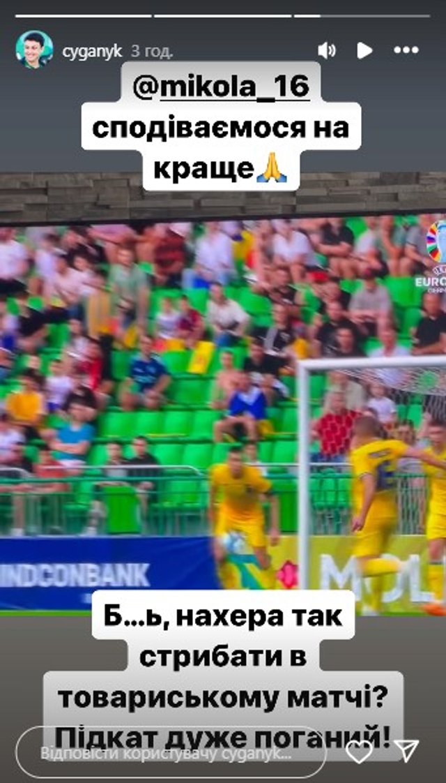 Игорь Цыганык в Instagram бурно отреагировал на этот момент. "Б...ь нах*ра так прыгать в товарищеском матче? Подкат очень плохой! Надеемся на лучшее!"