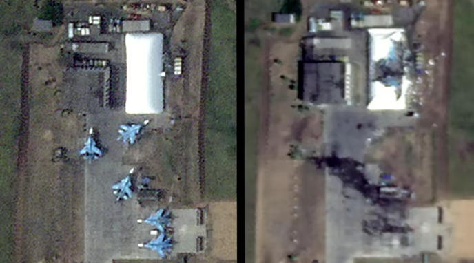 В то же время, на снимках от Planet Labs видно повреждение покрытия ангара, расположенного на перроне техобслуживания, а внутри виднеются два истребителя-бомбардировщика Су-34.