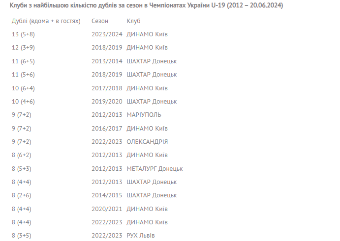 В прошлом чемпионате Украины среди игроков до 19-ти лет (U-19) зафиксировано 62 дубля. Чаще всего по два гола за игру забивали юноши «Динамо» - 13 (!) раз, на один пункт поднявшие планку своего же всеукраинского рекорда, хранившегося 5 лет.