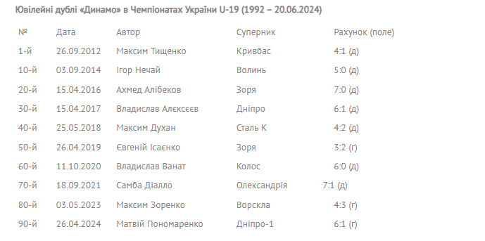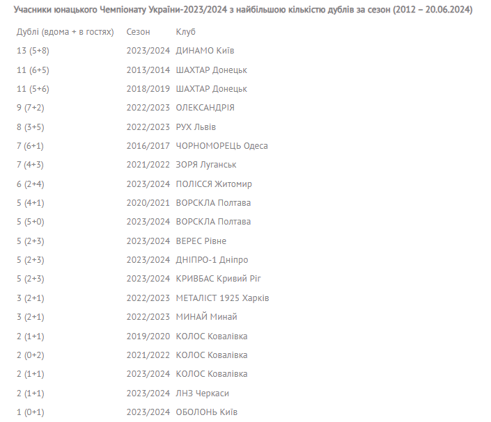 В прошлом чемпионате для некоторых других юношеских клубов также прошли знаковые события. Так повторили клубные рекорды юноши «Ворсклы», оформив 5 дублей, «Колоса» – 2. Подняли же уровни клубных рекордов представители «Вереса», «Днепра-1» и «Кривбасса»: все – до 5-ти дублей. В общей сложности в юношеских Чемпионатах зафиксировано уже 590 дублей, а чаще всего два гола в одном матче забивали игроки «Динамо» - 94 раза. И именно в прошлом чемпионате динамики первыми из всех клубов пересекли рубеж в «90 юношеских дублей». Автором юбилейного, 90-го, дубля динамовцев 26 апреля стал Матвей Пономаренко – в игре с «Днепром-1».