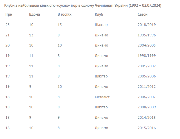 В прошлом Чемпионате Украины -2023/2024 наибольшее количество матчей без пропущенных голов провели чемпионы по «Шахтеру» - 14 игр, в том числе 8 на своем поле и 6 – в гостях. Всеукраинский рекорд по этому показателю также принадлежит «Шахтеру» – 23 «сухих» матча в сезоне-2018/2019. В «сухом» списке прошедшей VBET Лиги «Шахтер» только на одну игру опередил «Колос» и «Александрию», 12 игр без пропущенных голов было у «Кривбасса» и по 11 – у «Динамо», «Днепра-1» и «Полесье». Список же клубов с наибольшим количеством «сухих» игр во всех 33 украинских Чемпионатах продолжает уверенно возглавлять «Динамо» – 498 матчей, в том числе 275 на своем поле.