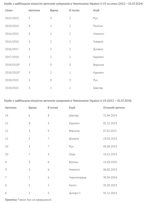 В ходе прошедшего Чемпионата Украины среди игроков до 19-ти лет (U-19) было 16 случаев, когда мяч влетал в ворота после рикошета от игрока своей же команды. «Помогали» забивать голы представители 10-ти клубов, а чаще всего – соперникам «Полесья»: 4 «самострела», в том числе по 2 на своем поле и в гостях. До повторения всеукраинского «рекорда» за сезон, который принадлежит соперникам «Руха», не хватило только одного автогола в пользу житомирского клуба. В общей сложности за всю историю проведения юношеских Чемпионатов зафиксирован 161 автогол, а чаще всего заставляли соперников ошибаться в свою пользу игроки «Шахтера» - 14 раз.