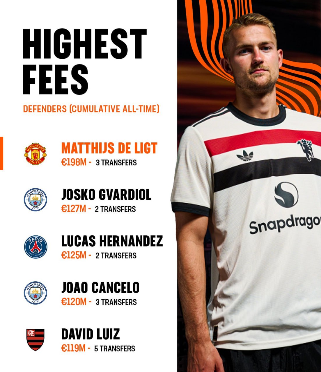 Маттейс де Лигт является самым дорогим защитником в истории, исходя из совокупной суммы трансферов, которая составляет 198 млн евро.