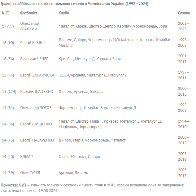 В свое время воспитанник черниговского футбола на пять лет отправлялся в загранкомандировку по маршруту Дортмунд — Лондон — Аль-Айн. Этих пяти лет Ярмоленко хватило бы для того, чтобы сейчас догнать лидера рейтинга по наибольшему количеству голевых сезонов — Александра Гладкого (17). Но у киевлянина есть время, чтобы сократить дистанцию.