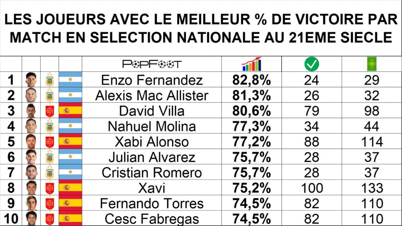 Хавбек сборной Аргентины Энцо Фернандес имеет лучший процент побед в своей национальной команде в 21 веке (24 победы в 29-ти матчах).
