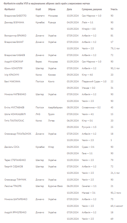 В сентябрьских матчах за национальные сборные своих стран сыграли представители восьми клубов УПЛ. Наиболее широкое представительство имели "Динамо" (семь футболистов в главной команде Украины) и "Шахтер" (четверо - в сборной Украины, один - Буркина-Фасо).