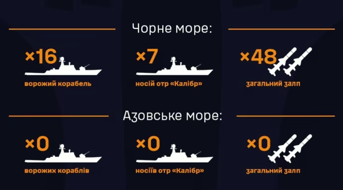 По состоянию на утро 14 сентября в Черном море находятся 16 вражеских кораблей, 7 из которых являются носителями крылатых ракет "Калибр" общим залпом до 48 ракет.