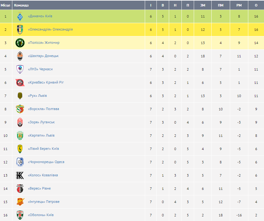 "Динамо" продолжает находиться на 1-м месте в УПЛ после 7-го тура