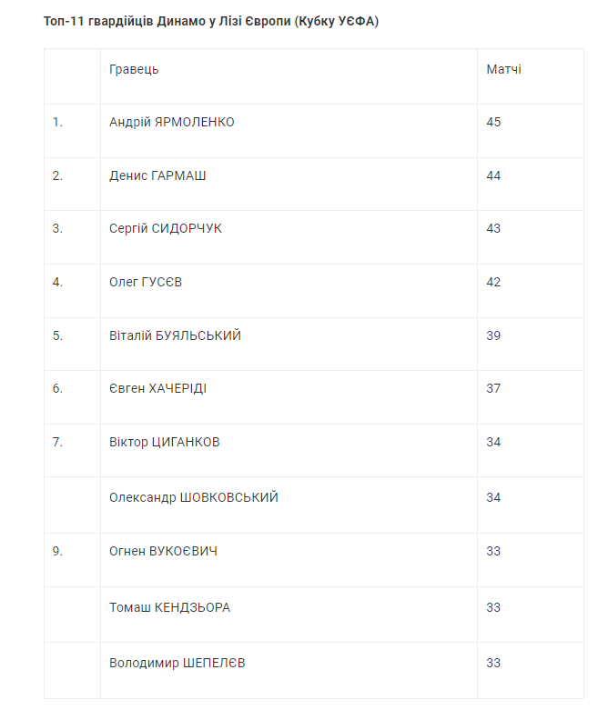 Между тем, Ярмоленко вошел в топ-10 гвардейцев украинских клубов. Причем, как в Лиге Европы (Кубке УЕФА), так и в еврокубках в общем, в которых он провел за «Динамо» 89 игр.