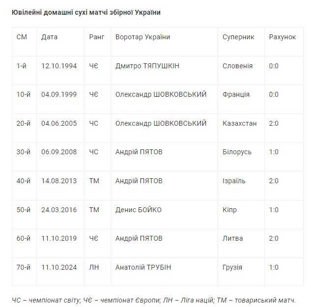 Сборная Украины, обыграв Грузию со счетом 1:0, провела 70-й сухой матч в истории на своем поле. 24 раза наша национальная дружина не пропускала дома в товарищеских матчах, 20 - в чемпионатах Европы, 19 – в чемпионатах мира, 6 – в Лиге наций и 1 – в международных турнирах. Посильный вклад в юбилей внесли 18 голкиперов.
