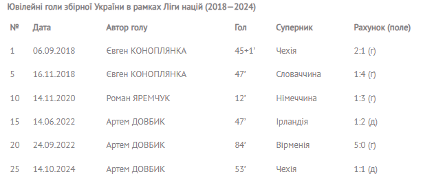 Во Вроцлаве в матче Лиги наций УЕФА со сборной Чехии Артем Довбык стал автором юбилейного (25-го) гола украинской сборной в рамках этого турнира. Интересно, что Артем забивал и два предыдущих юбилейных гола в ЛН.