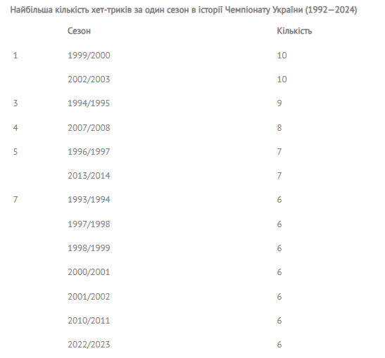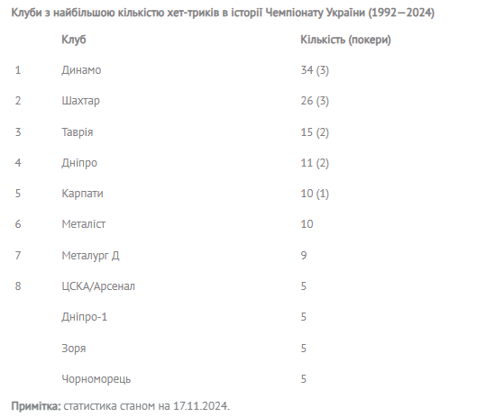 Больше всего хет-триков в коллекции игроков «Динамо» (34), «Шахтера» (26) и «Таврии» (15).