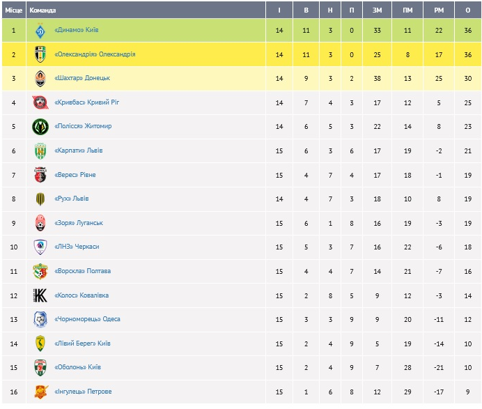 "Александрия" дышит в спину "Динамо". Турнирная таблица Премьер-лиги после 15-го тура