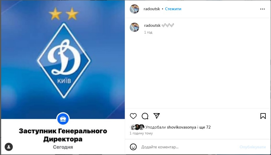 Сегодня Максим Радуцкий, ранее занимавший должность директора "Динамо" по развитию бизнеса, распространил на своей странице в Инстаграмме информацию о том, что он назначен на пост заместителя генерального директора киевлян.