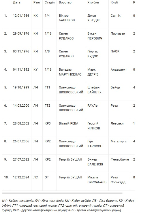 Воротарі Динамо, які парирували пенальті в єврокубках