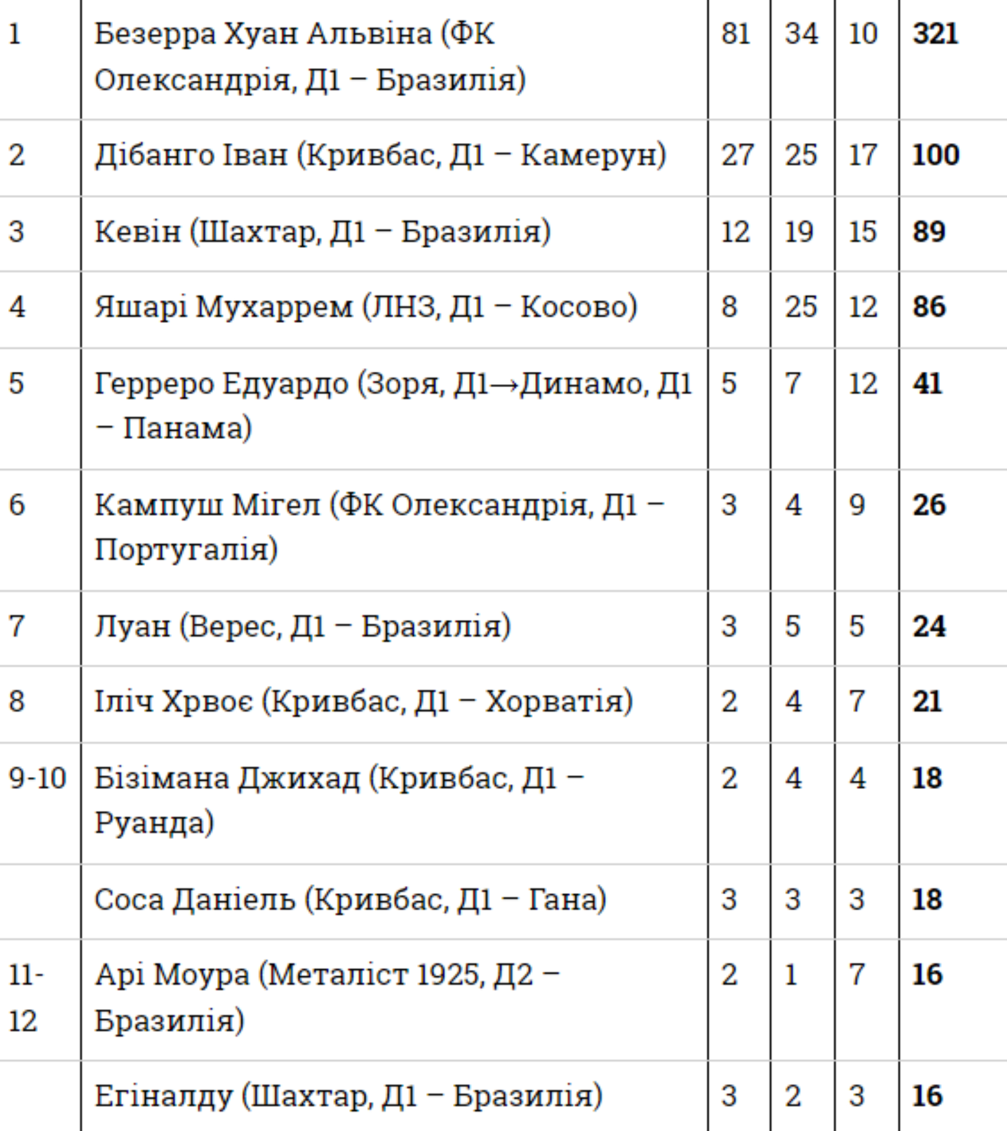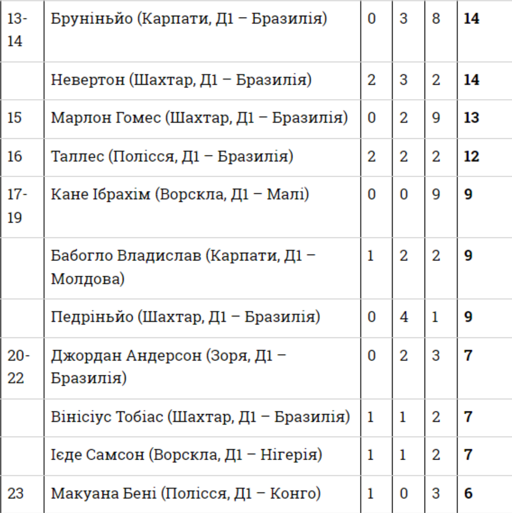 - Алекс Тейшейра (Бразилія ‒ Шахтар) — 50 (7-11-7)