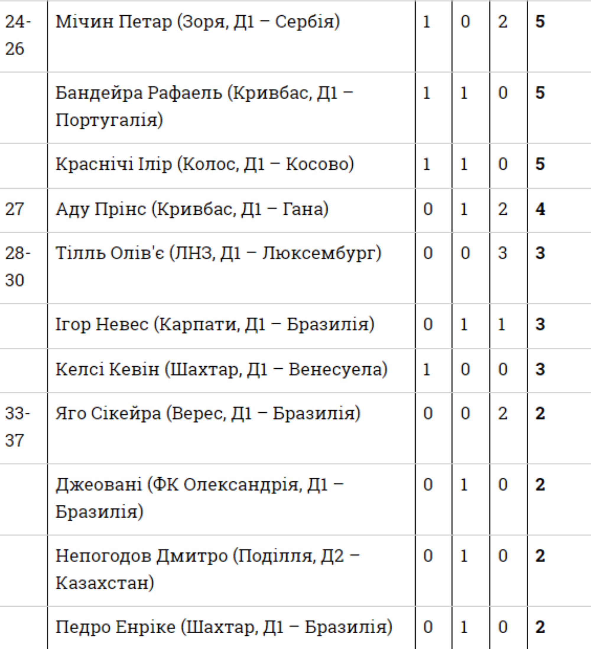 - Гіоргі Гочолеішвілі (Грузія – Шахтар) — 37 (4-9-7)