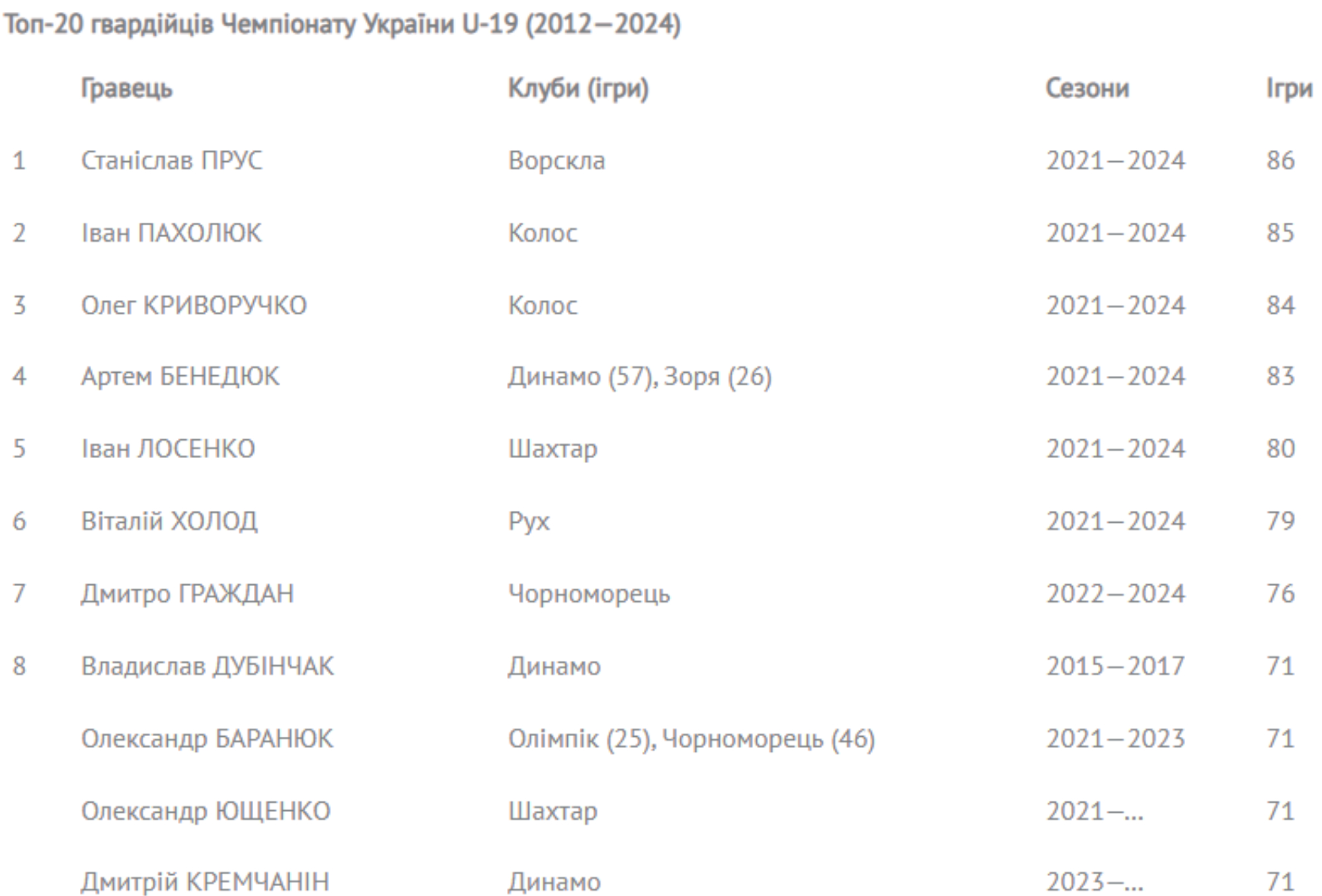 По итогам первой части текущего Чемпионата Украины U-19 в первую десятку рейтинга гвардейцев попал Дмитрий Кремчанин из "Динамо", в активе которого сейчас 71 игра.