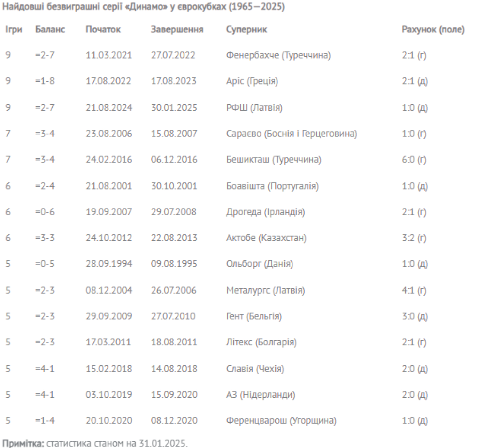 Победив в рамках основного турнира Лиги Европы латвийский клуб РФШ со счетом 1:0, "Динамо" прервало свою безвыигрышную серию в еврокубках, которая с 21 августа 2024 года продолжалась на протяжении рекордных для клуба 9 игр: 2 ничьих и 7 поражений.