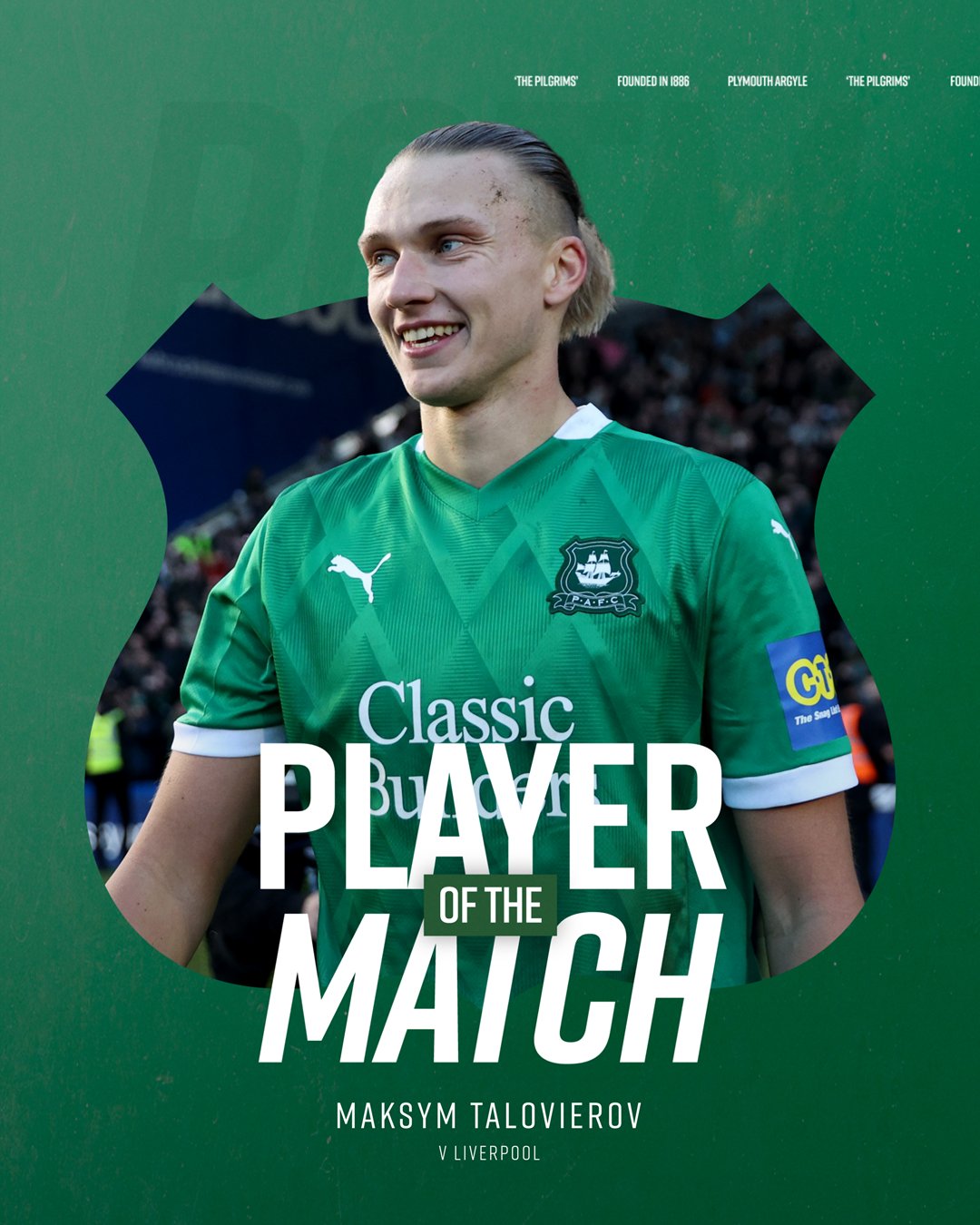 Украинский защитник "Плимута" Максим Таловеров стал лучшим игроком матча Кубка Англии против "Ливерпуля".