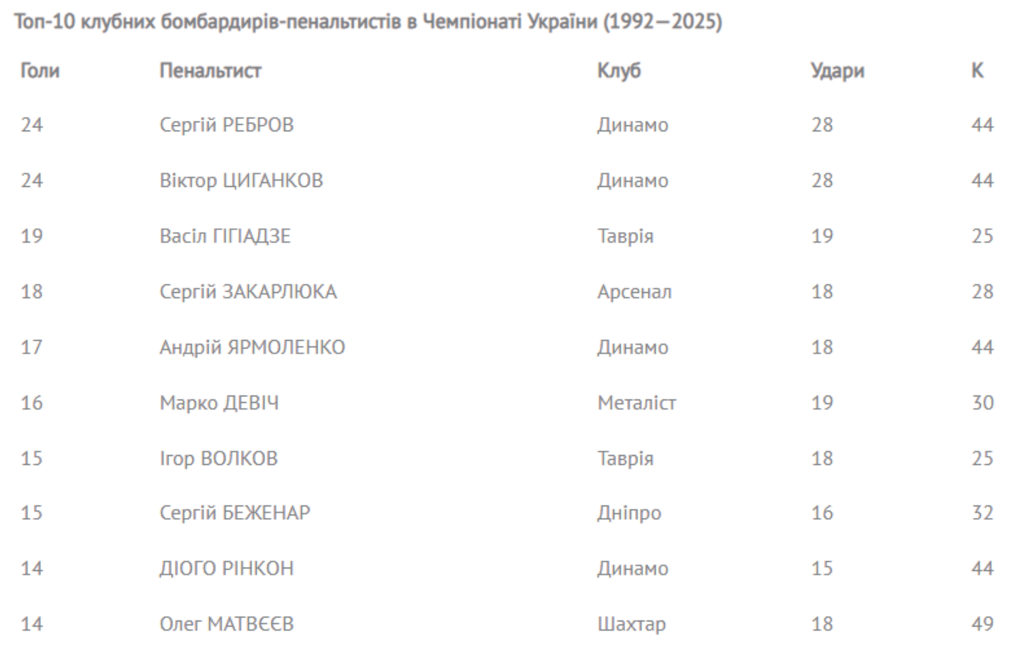 Возглавляют же этот рейтинг забивных пенальтистов представители "Динамо" Сергей Ребров и Виктор Цыганков - по 24 гола с "отметки".