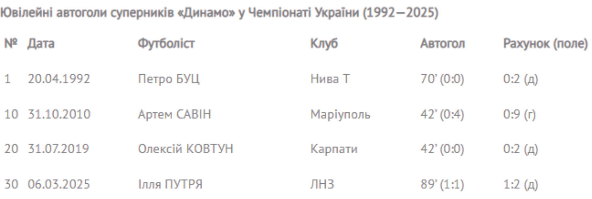 В матче 20-го тура сезона-2024/2025 ЛНЗ - "Динамо" защитник черкасского клуба Илья Путря, срезав мяч в собственные ворота, стал автором юбилейного, 30-го, "самострела" соперников динамовцев в истории чемпионата Украины.
