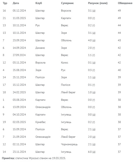 В матчі 21-го туру з «Карпатами» (0:0) футболісти «Шахтаря» виконали 49 спроб обведеннь і повторили власний рекорд сезону-2024/25 в Чемпіонаті УПЛ. Вдалими вийшли тільки 24 спроби, це 49% успішності, що нижче за середній показник туру (51%).