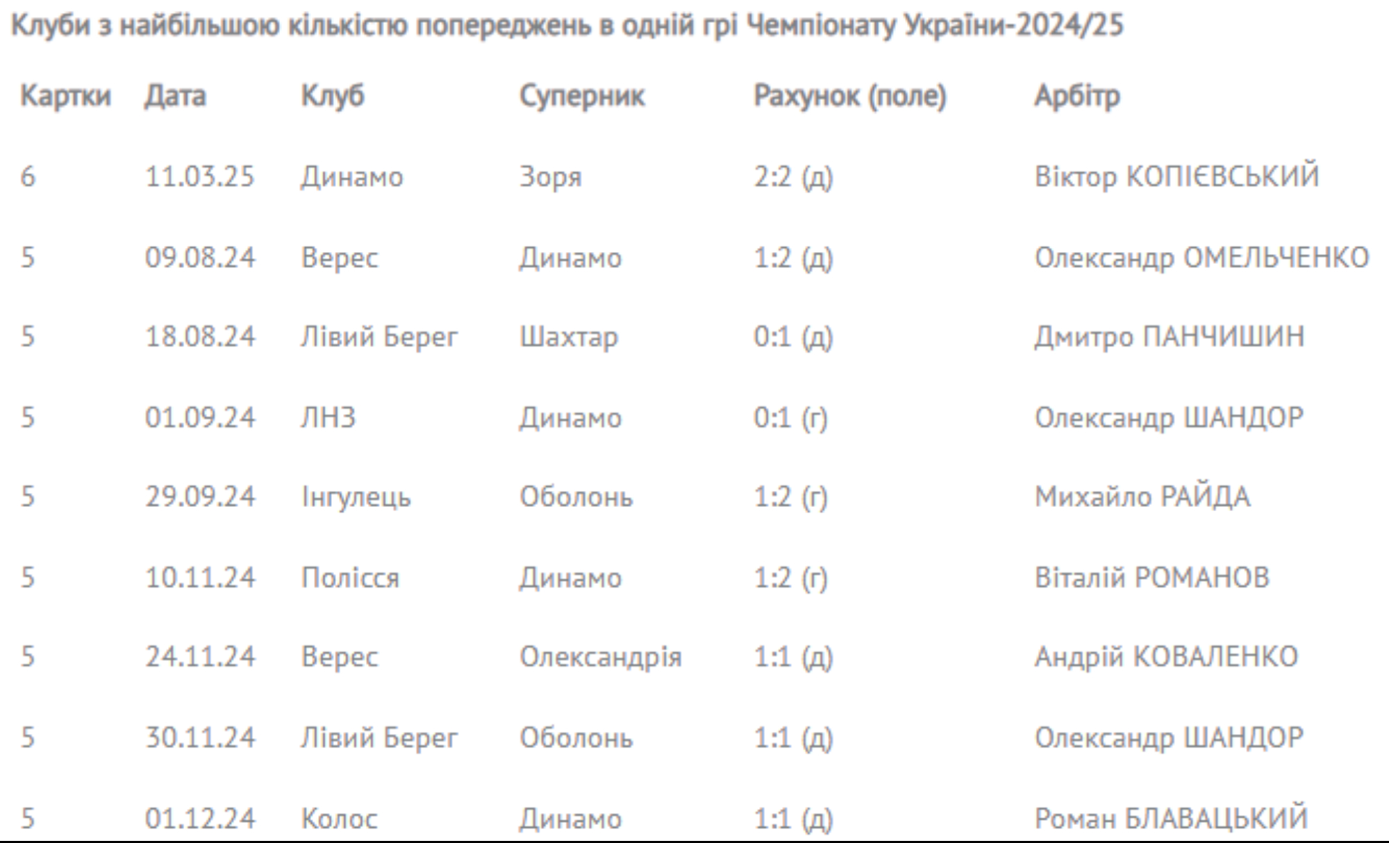 Интересно, что даже при этом "Динамо" продолжает оставаться самой дисциплинированной командой сезона-2024/25 в УПЛ. Ее игроки имеют 27 желтых карточек и ни одной красной.