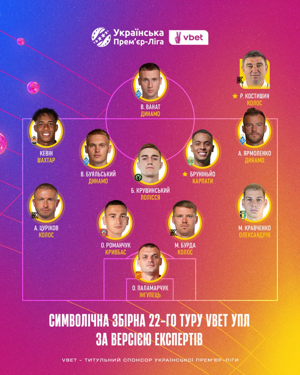 Лучшим тренером 22-го тура группа экспертов признала вернувшегося к рулю "Колоса" Руслана Костышина и прервавшего серию из четырех поражений подряд, выиграв у "Зари" — 3:0. В топ-3 тренера 22-го тура также вошли Владислав Лупашко ("Карпаты") и Александр Шовковский ("Динамо").