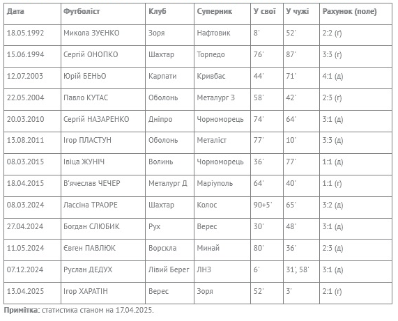 Гравці, які забивали голи у ворота своєї та чужої команди в одному матчі Чемпіонату України