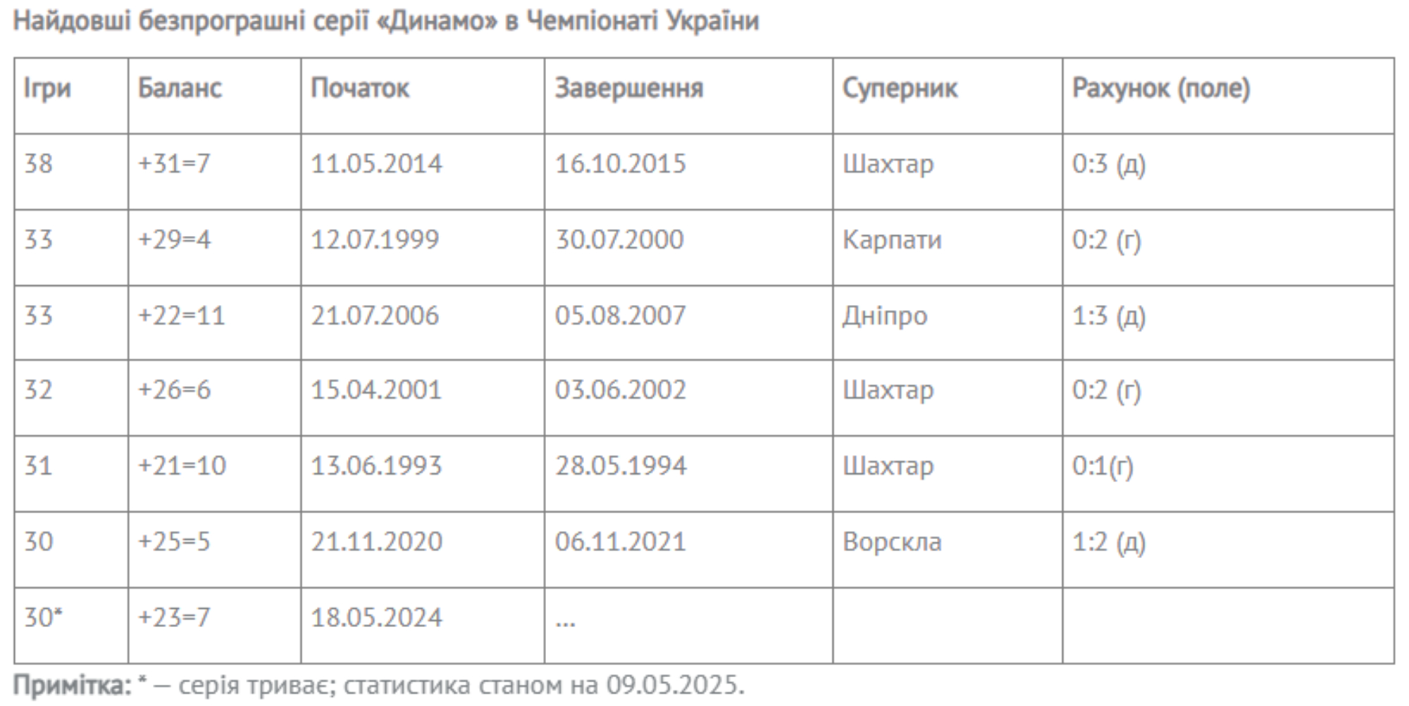 А "Динамо" может похвастаться тем, что в 30-м выездном матче в УПЛ под руководством Александра Шовковского увеличили свою беспроигрышную серию до 30-ти игр. Более продолжительных серий без поражений в новейшей истории киевского клуба было всего пять.