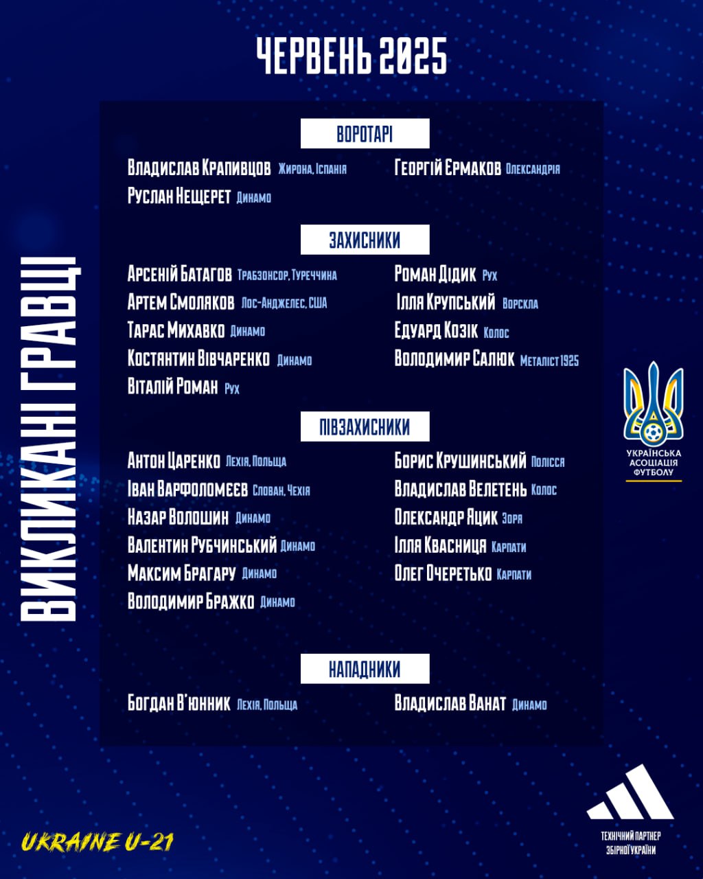 В этом перечне есть десять игроков "Динамо". В частности, это вратарь Руслан Нещерет, защитники Тарас Михавко и Константин Вивчаренко, полузащитники Антон Царенко, Назар Волошин, Валентин Рубчинский, Максим Брагару, Владимир Бражко и Александр Яцык и форвард Владислав Ванат.